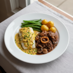 • Finition : Mélanger persil et ciboulette fraîche hachés (50g total) 30 secondes avant service. Dresser filet assiette chaude (+60°C), napper sauce crème aux herbes sans délai. Service immédiat.