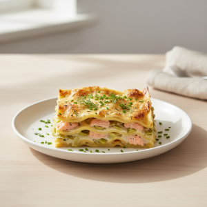 Lasagnes saumon-poireaux : plat clé en main pour restauration collective, conforme EGAlim. Saumon bio ou Label Rouge en circuits courts, poireaux locaux, béchamel légère (cuisson basse température). 600 g/assiette, coût maîtrisé, rendement 90%+.