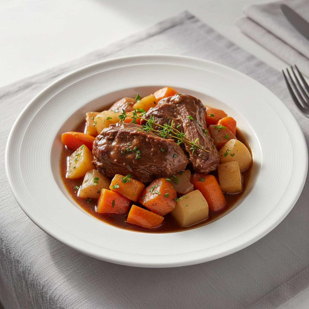 - Le jour du repas : réchauffez doucement à four 160°C, 20-30min couvert, sans bouillir. Servez dans des assiettes creuses bien chaudes avec le jus de braisage.