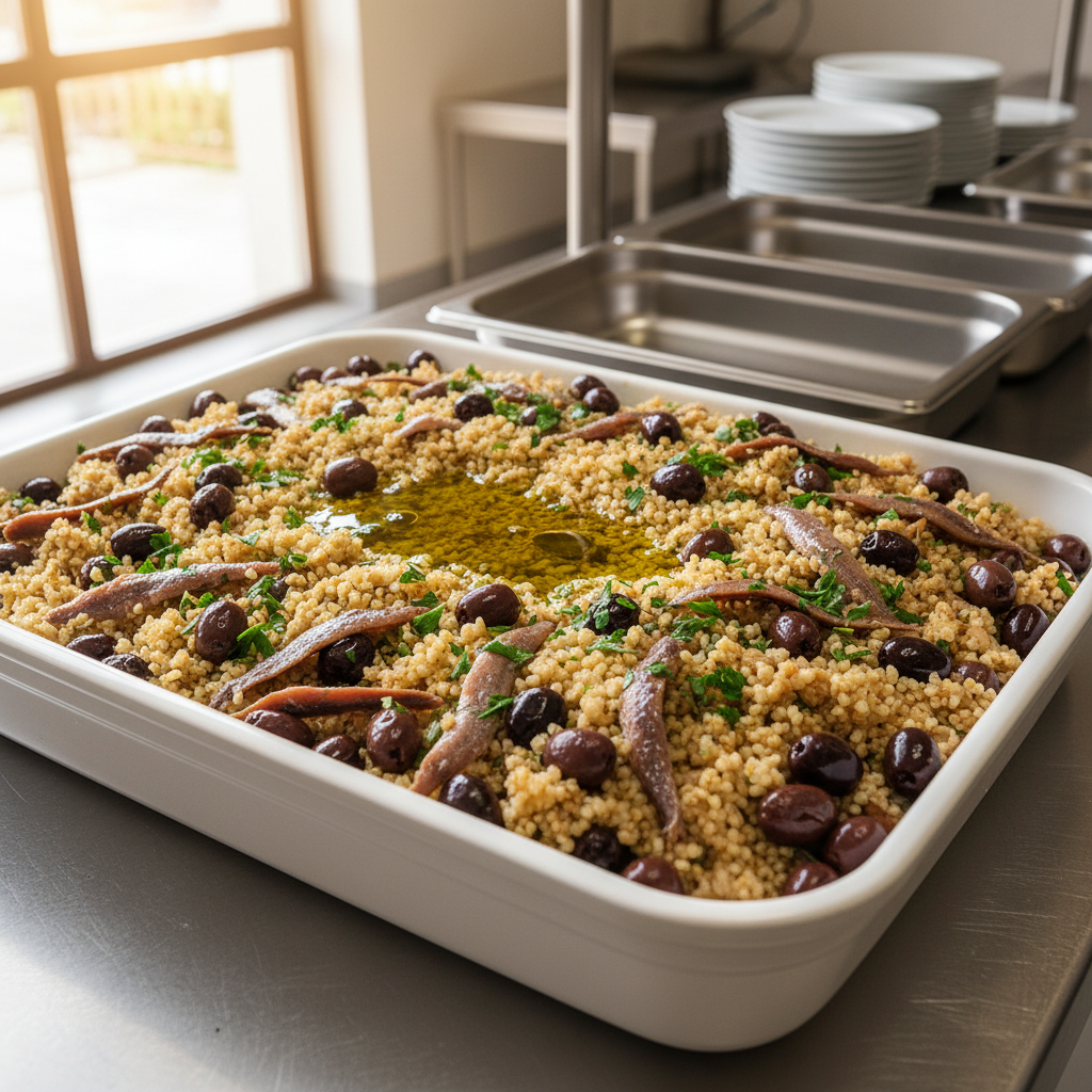 Une recette méditerranéenne simple et saine : du boulgour complet cuit à la vapeur, des olives noires authentiques, des anchois frais en filet fin, et de vraies tomates cerises. Tous les ingrédients sont bruts, bio, sans chimie — juste des saveurs vraies à découvrir en famille.