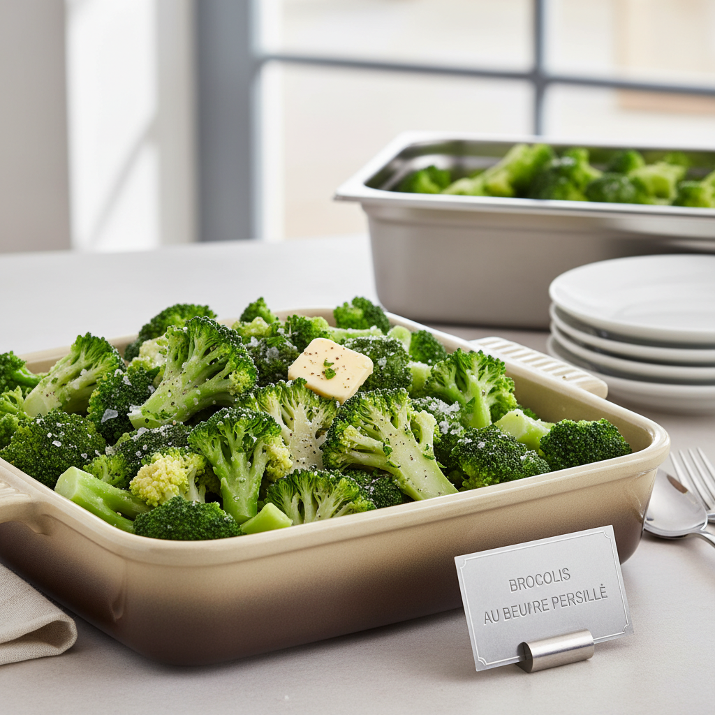 - Dressage : transférer brocoli chaud en assiette, napper aussitôt du beurre persillé (il va fondre). Servir immédiatement.