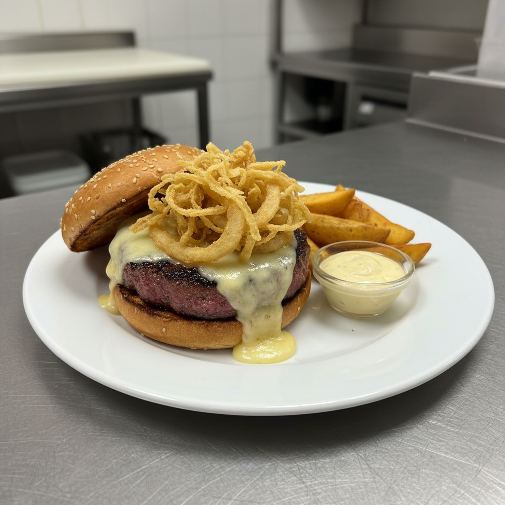 Référentiel Restauration Collective » Restauration collective » Burger fermier au Cantal et oignons frits croustillants — Recette maison facile