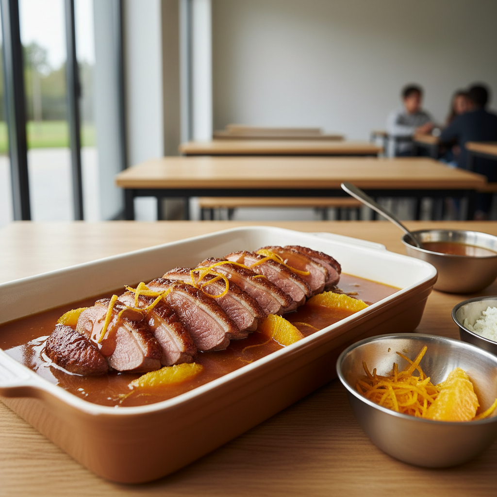Servez avec du riz basmati bio ou des carottes étuves. Le canard se déguste légèrement rosé à cœur, mais en maison collectivité, cuisez-le à +74°C pour la sécurité de tous. Restent 2-3 jours au frigo dans un bac hermétique.