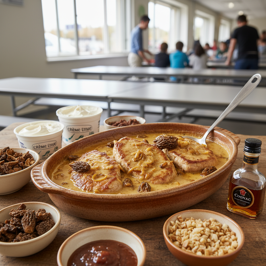 - Réservez escalopes assiette chaude. Dans poêle : versez trait de cognac, versez crème fraîche + bouillon chaud, ajoutez morilles finement coupées + échalotes. Mélangez 2 min, sauce devient crémeuse. Goûtez, ajustez sel poivre.