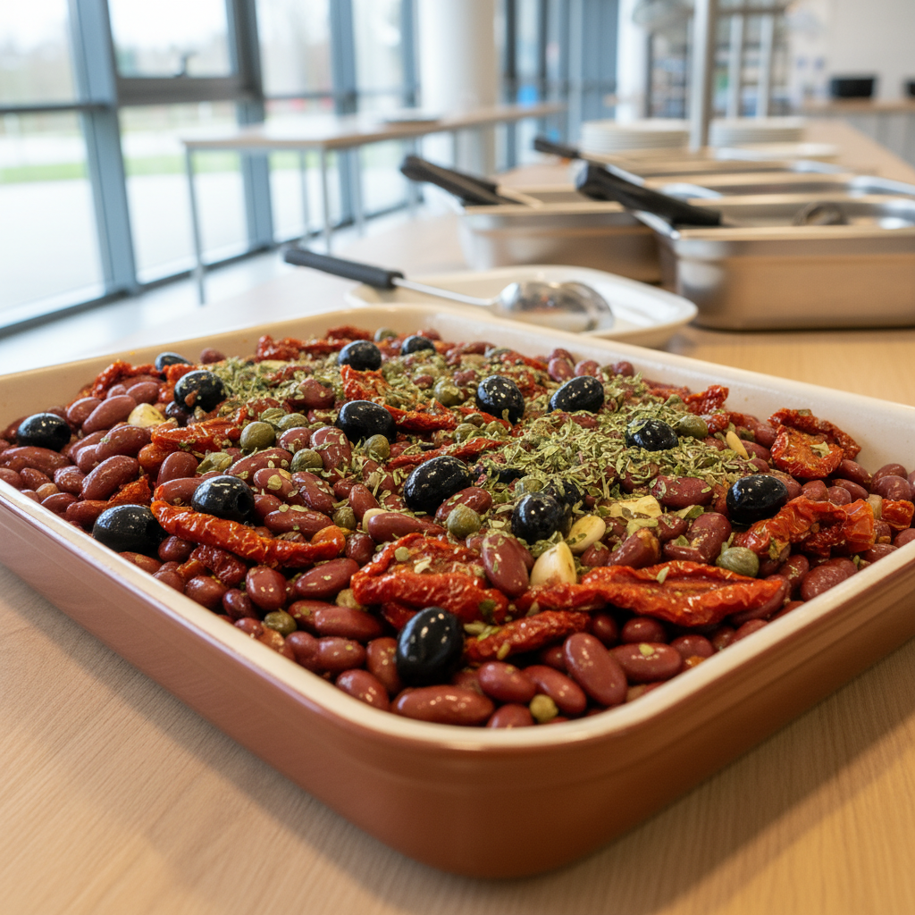 - Veille soir : égoutter haricots, mélanger avec tomates + huile + 80g olives noires + 1 c.à.s. câpres + 2 gousses ail écrasées + 1 c.à.c. origan frais. Sel/poivre léger. Réfrigérer couvert.