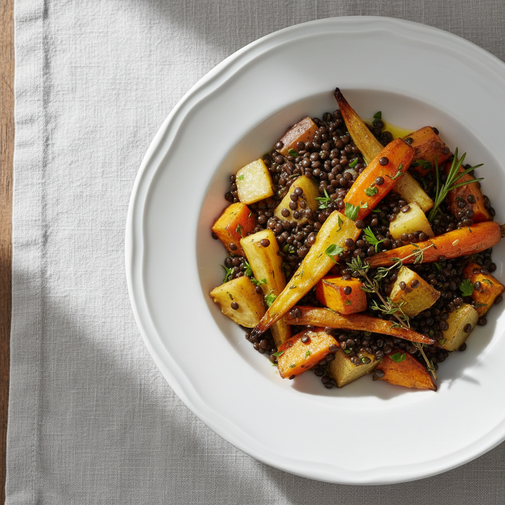 - À table : Égouttez les lentilles, versez-les dans un saladier chaud. Ajoutez les légumes rôtis. Mélangez doucement. Saupoudrez d'herbes de Provence fraîches si vous en avez. Servez chaud.
