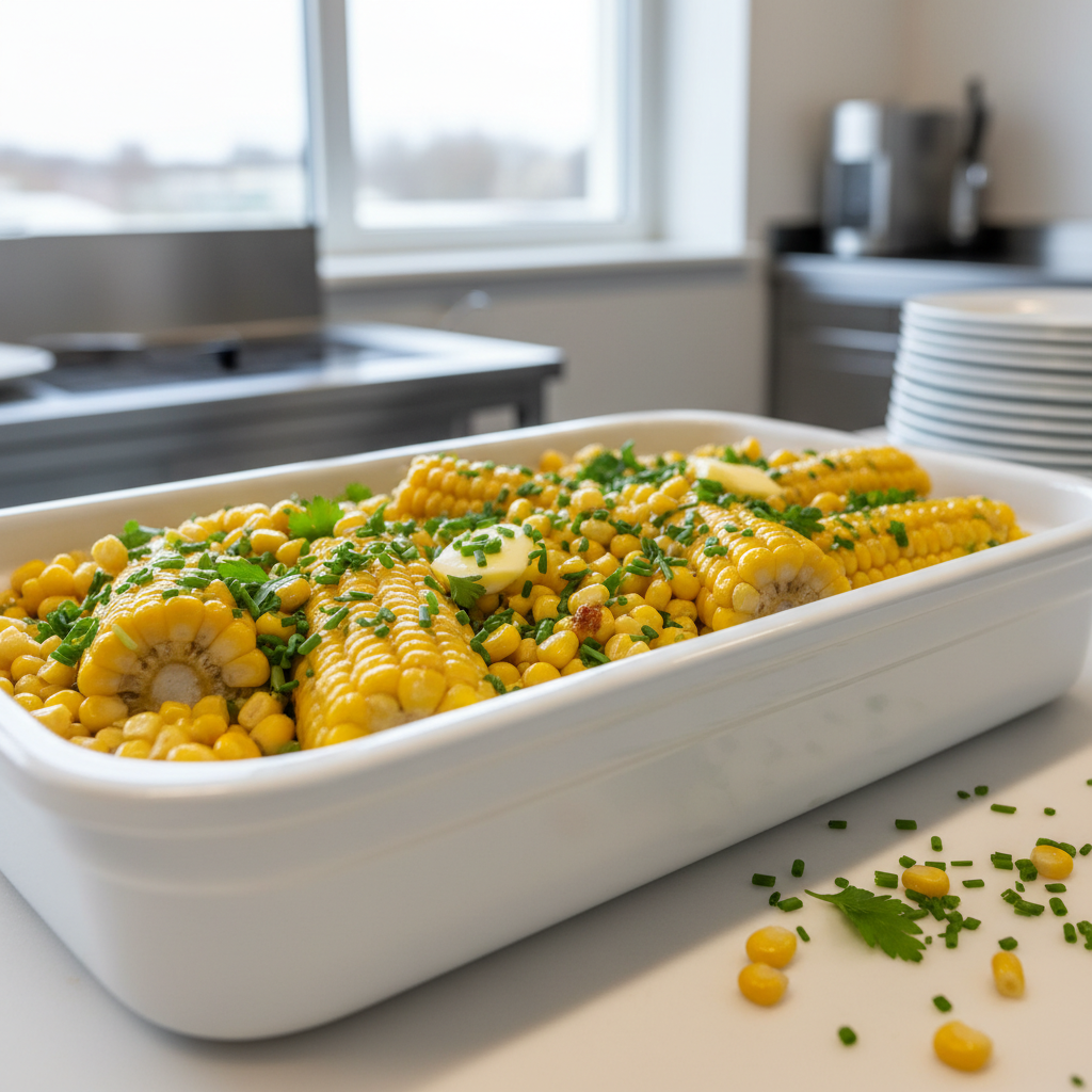 • Finition (5 min) : Transférez le maïs chaud dans un plat. Versez le beurre ramolli (ne pas faire bouillir) et mélangez doucement. Ajoutez les herbes ciselées juste avant de servir, quelques tours de moulin à poivre. Goûtez et rectifiez le sel.