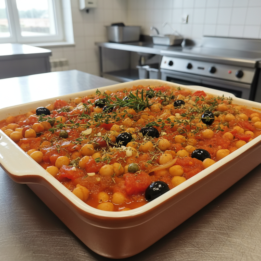 Voici une recette méditerranéenne généreuse, saine et délicieuse, parfaite pour les repas en famille ou entre amis. Riche en protéines et fibres, les pois chiches se marient harmonieusement avec la saveur acidulée des tomates et des olives noires.