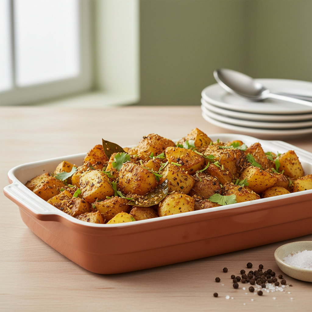 - Étape 4 — Service : À la sortie du four, les pommes de terre doivent être bien dorées et croustillantes. Goûter pour vérifier l'assaisonnement (garam masala peut être relevé). Servir bien chaud.