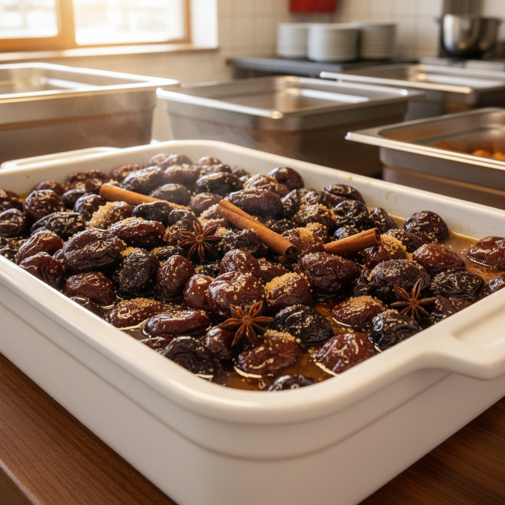 - Refroidissement : Versez prunes + sirop dans un plat large, laissez reposer 2 heures à température ambiante, puis 1-2 heures au frigo. Elles gagnent en saveur en refroidissant.