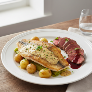 Jour J : Poêlage raie à cœur 62-65°C (9-12 min selon épaisseur). Liaison sauce ≥+63°C maintenue. Service immédiat. Vérifier absence arêtes cartilage résiduel. EGAlim : Moutarde bio ECOCERT recommandée (label AB). Crème fraîche AOP si possible (circuit court laitier régional). Vin blanc sec AOC local (Provence). Raie sauvage : vérifier MSC ou pêche durable. Estimé 30-35% bio en valeur. Alternative végétale : filet de champignon de Paris poêlé sauce moutarde-crème pour maintien équilibre protéines et texture. Déclinaisons : Texture modifiée : Raie effilochée fin pour PMR/dysphagie, sauce lissée au mixer. Végétarienne : Champignons de Paris de 250g poêlés, même sauce moutarde-crème. Bio : Tous ingrédients AB certifiés, raie pêche durable. Sans allergène (sans moutarde) : Remplacer par sauce crème-estragon ou crème-câpres (vérifier origin câpres bio).