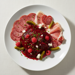 - Mélange Jour J : verser betteraves cuites dans marinade, repos minimum 2h à +3°C avant service (diffusion arômes framboise). Homogénéisation douces.