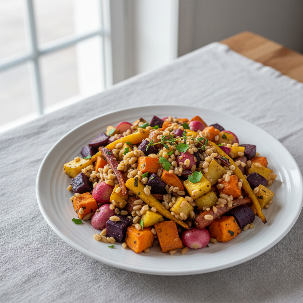 Déclinaisons : Texture modifiée : blé écrasé légèrement pour seniors (texture modifiée A). Alternative végétarienne : recette naturellement végétarienne, envisager complément protéique légumineuse (lentilles corail, pois chiches). Variante sans allergène : remplacer amandes effilées par graines de courge bio ou tournesol bio (sans fruit à coque). Adaptation sans gluten : utiliser épeautre bio ou riz complet bio à la place du blé.