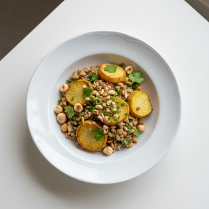 Le blé, céréale complète souvent sous-exploitée en restauration collective, mérite une revalorisation. Cette recette l’associe à deux produits d’excellence : le topinambour, tubercule local et saisonnier d’automne-hiver, et la noisette, fruit à coque riche en acides gras insaturés. Cuisson basse température garantit un blé nacré, non empâté, et la conservation maximale des qualités nutritionnelles et sensorielles.