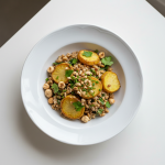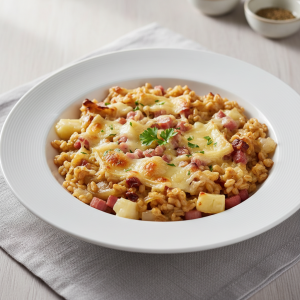 - Jour J (1h30 avant service) : étuver oignons fins 150g émincés + 50g beurre/huile olive bio, cuire pommes de terre 250g cubes-brunoise 12-15 min à la vapeur, salage modéré (4g/kg, fromage AOP ≥300mg Na/100g). Mélange : blé cuit + pommes de terre + oignons + 200g reblochon râpé + 100g crème fraîche bio, tempérage ≤+15°C max 20 min.