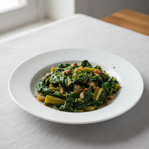 - Ajouter feuilles de blettes, saler (6g/kg blettes brutes), poivrer. Remuer 5 min à feu moyen-vif : libération eau résiduelle et début coloration.