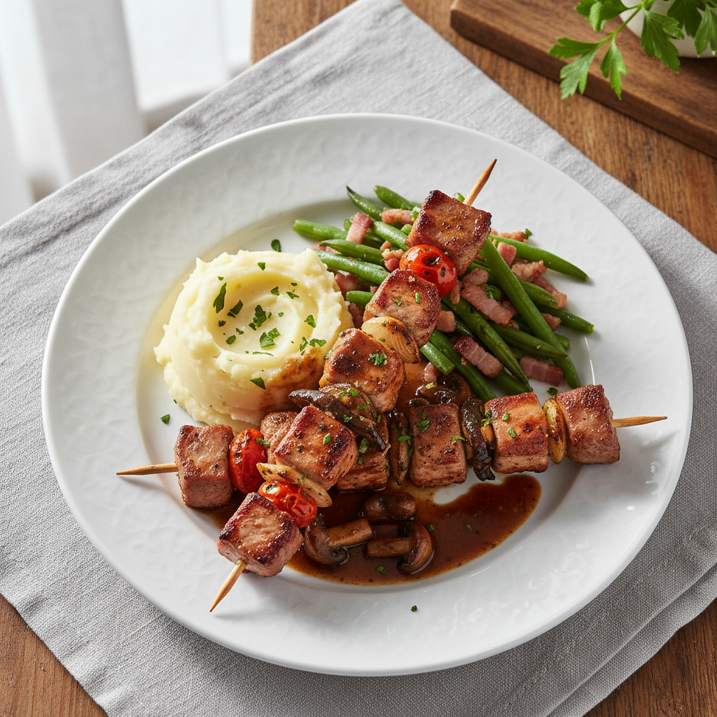Cette brochette équilibrée répond aux attentes nutritionnelles (P1 : 100-120g porc cuit/100cvts), à la demande croissante de plats colorés attractifs, et aux contraintes EGAlim. Montage simple en cuisine, cuisson rapide, facilement déclinable. Porc fermier régional + fruits frais bio = signature qualité restauration durable. Applicable en restauration collective comme en restauration commerciale.