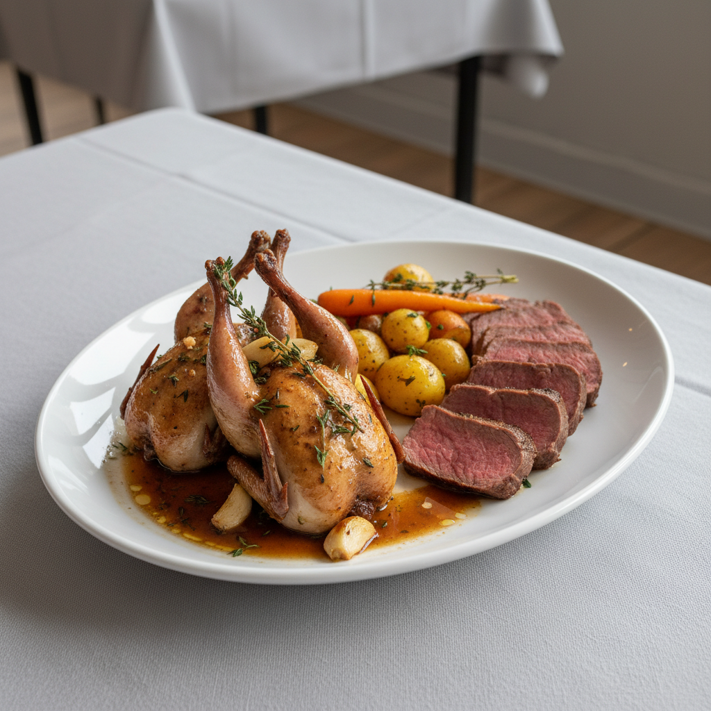 Déclinaisons : Texture modifiée : cailles désossées, sauce lissée au mixeur plongeant pour dysphagie niveau 2. Alternative végétarienne : champignons de Paris fermiers bio braisés au cognac, beurre noisette, crème fraîche et thym (même sauce, même temps cuisson 25min). Variante sans allergène : remplacer cognac par vinaigre balsamique + miel local (aromatique équivalent). Sans sulfites : vérifier fournisseur cognac ou remplacer par armagnac bio sans sulfites ajoutés.