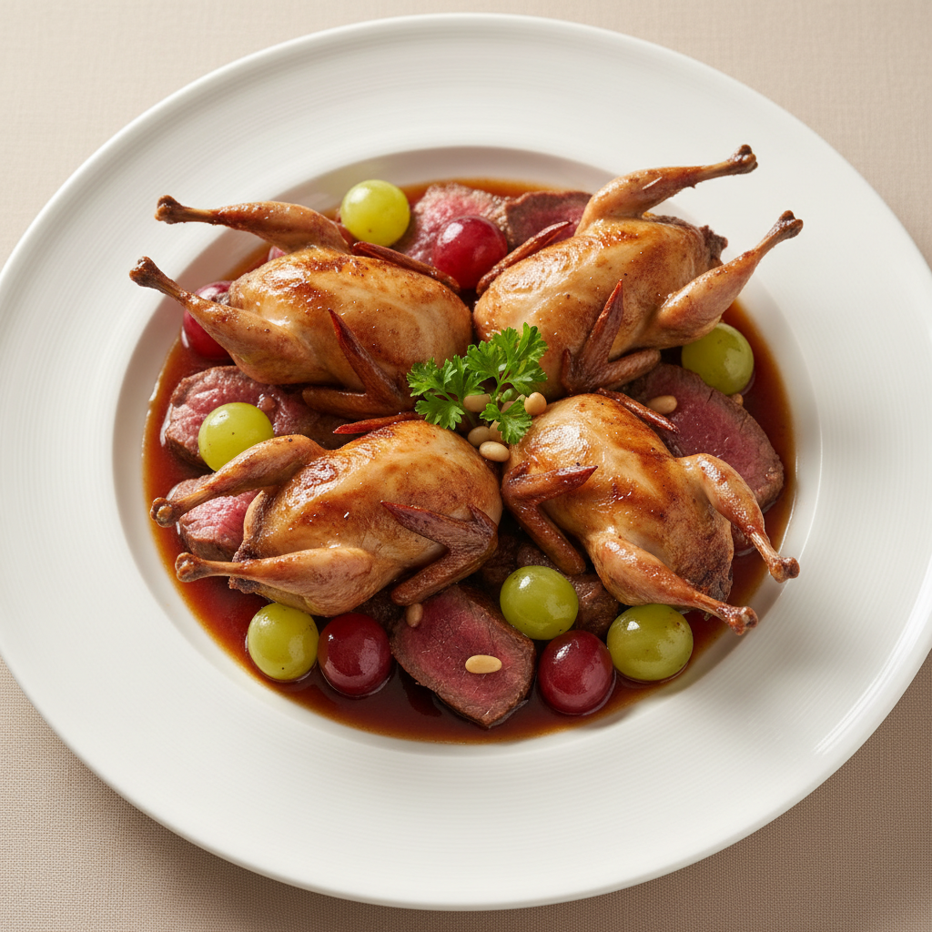 Déclinaisons : Texture modifiée (purée/mousse) : cailles désossées, miel-soja réduit en coulis. Alternative végétarienne : gros champignons de Paris ou pleurotes entiers bridés, même glaçage. Variante sans gluten : remplacer sauce soja classique par tamari certifié sans gluten. Variante sans sésame : remplacer graines par germe de blé grillé bio.