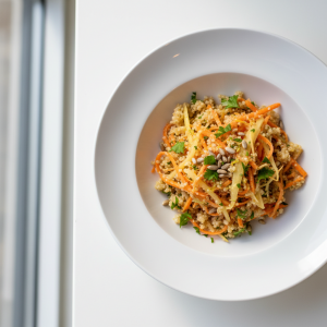 Cette entrée de salade crudités valorise les circuits courts et répond pleinement aux critères EGAlim. Recette simple à décupler pour 600 couverts, sans équipement lourd. Les carottes râpées conservent leur croquant et nutriments en liaison froide. Le quinoa, pseudo-céréale complète, apporte protéines et minéraux essentiels, idéal pour équilibrer un menu scolaire ou social.
