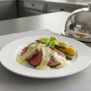 - Fin cuisson : filets opaque, chair nacrée, chair se détachant facilement à la fourchette. Transférer assiettes chaudes (plateau chauffant 65°C). Sauce hollandaise en bain-marie doux (50-55°C), jamais > 60°C : ajouter progressivement à côté du filet (80g/portion).