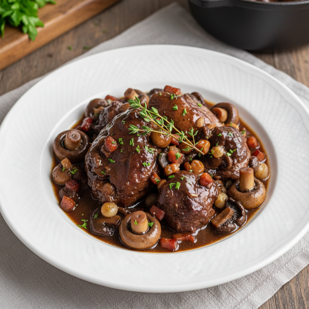 Déclinaisons : Texture modifiée : coq effiloché sauce velouté pour seniors/dysphagie. Alternative végétarienne : champignons de Paris + portobello braisés vin jaune, crème de châtaigne. Variante vegan : oignons grelots caramélisés, jus de champignon déshydraté, crème de soja bio. Adaptation sans sulfites : morilles fraîches début automne, vin jaune sans SO₂ additionnel.