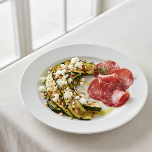 - Dressage immédiat sur assiette chaude (≥+60°C). Courgettes en base, féta répartie, menthe fraîche, pignons parsemés. Filet huile olive vierge extra (5ml/portion).