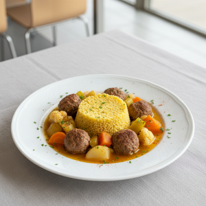 - Dressage et service : Dans assiette creuse ou gastro, disposer 250g semoule, 300g légumes assortis, 4 boulettes (100g), 150 ml bouillon parfumé. Parsemer coriandre fraîche 2g/portion. Service immédiat > +63°C. Plat témoin 80g, conservation +3°C 5 jours. Compostage des parures non utilisées.