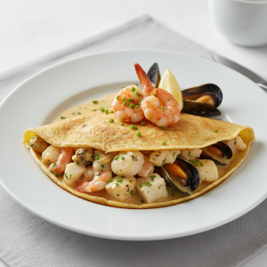 - Jour J (5 min avant service) : Réchauffer sauce normande au bain-marie à cœur ≥+63°C (2 min). Ajouter fruits de mer décongélés ou frais (90g/portion) 2-3 min max dans sauce (éviter surcuisson, maintenir textures croquantes). Garnir crêpe, napper sauce 30g, dresser assiette chaude.
