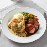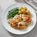 - Enfourner à +180°C sur lit oignon. Peau vers le haut. Verser glaçage dessus régulièrement (minimum 3 brossages à +15, +30, +40 min). Cuisson totale : 50 min pour cuisses 200g, température à cœur +74°C OBLIGATOIRE (mesurer thermomètre probe au point le plus épais, sans toucher os).