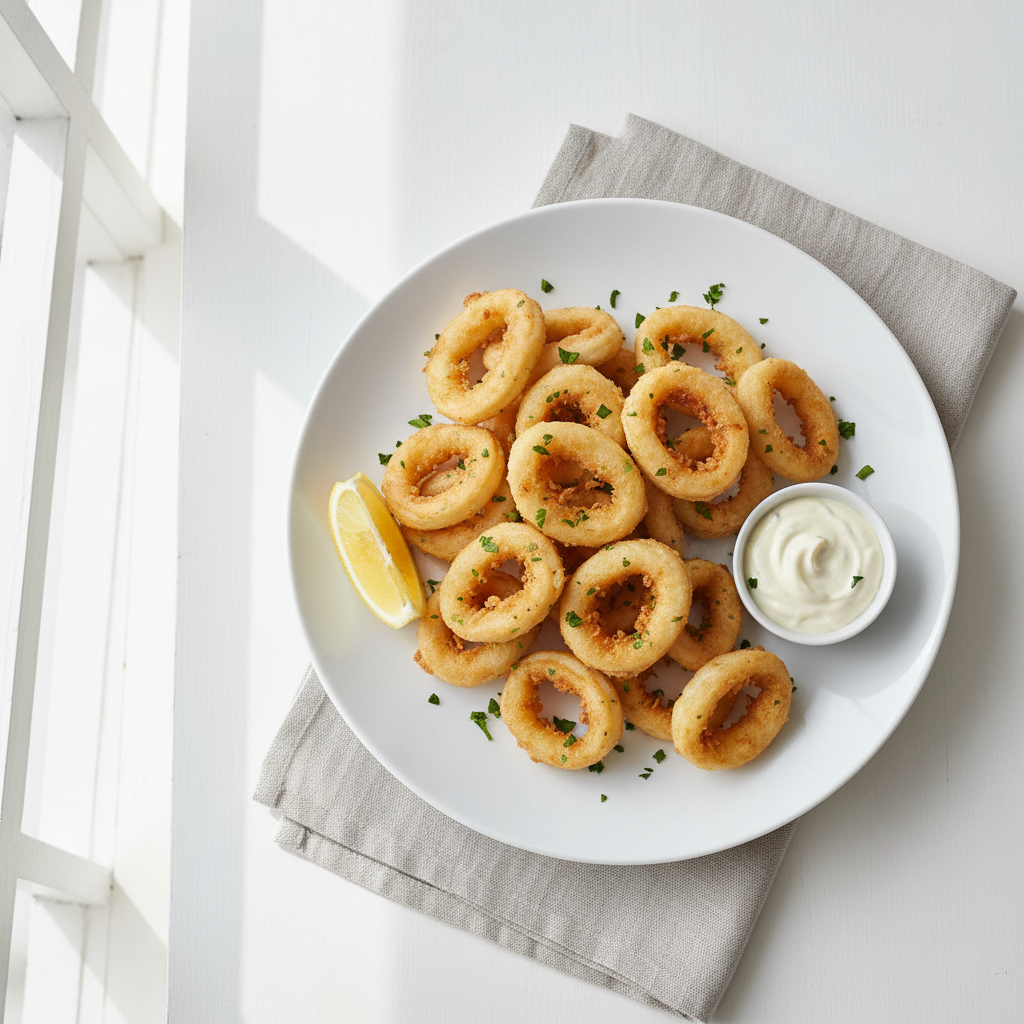 Saisonnalité : Encornets disponibles frais toute l'année en Méditerranée, pic printemps-été. Remplacer encornets surgelés par frais selon arrivages mareyeur local. Sauce tartare : cornichons français, câpres de Provence si disponibles, moutarde de Dijon AOP.