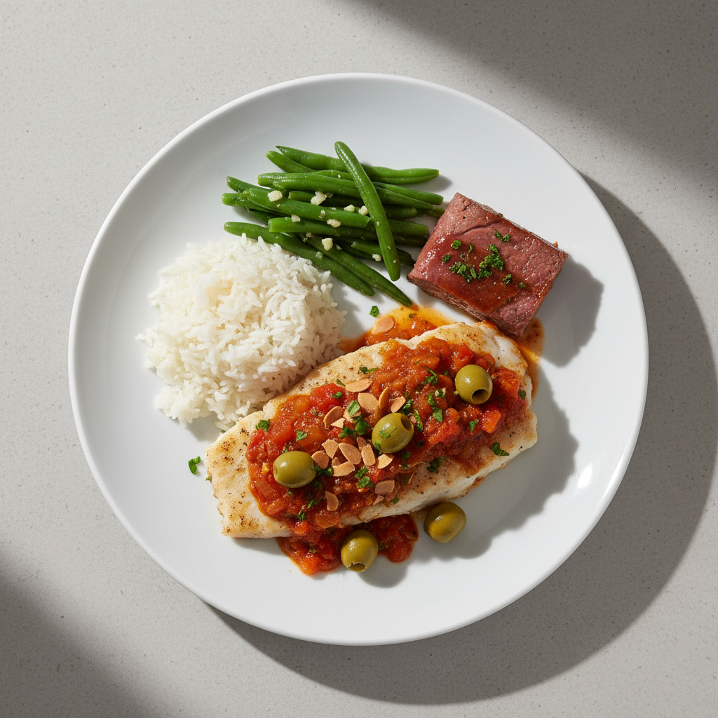 Déclinaisons : Texture modifiée (dysphagie) : Poisson mixé fin + sauce curry réduite en purée lisse, servie en cuillère. Alternative végétarienne : Bloc de tofu ferme fumé (150g) poché 8 min, même sauce curry-coco, basilic thaï, lime. Variante bio : Poisson de ligne pêche durable bio, curry vert bio équitable, lait de coco bio ECOCERT. Sans allergène : Remplacer lait de coco par crème de riz ou bouillon de légumes bio riche (maintien saveur).
