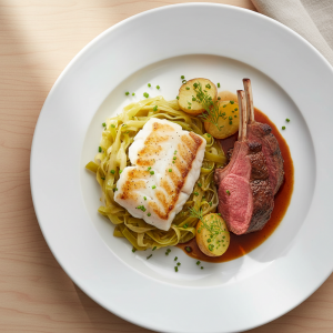 - Finition : filet déposé sur lit de poireaux confits. Crème fraîche bio versée chaud (≥63°C final), émulsion à froid si liaison froide. Muscade râpée fraîche, persil ciselé. Dressage immédiat.