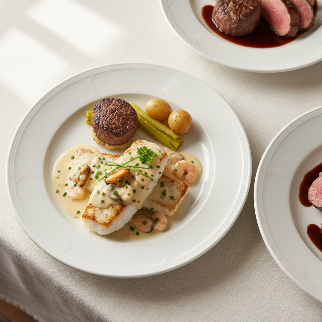 La sauce Dugléré est une base de cuisine collective : équilibrée nutritionnellement, économe en matières grasses, valorisant les circuits courts. Filet poisson vapeur + réduction vin blanc + champignons/échalotes = recette stable, peu de déchet, facilement déclinable. Poisson MSC ou bio obligatoire (EGAlim). Montage final hors feu garantit une sauce lisse, sans séparation lipidique.