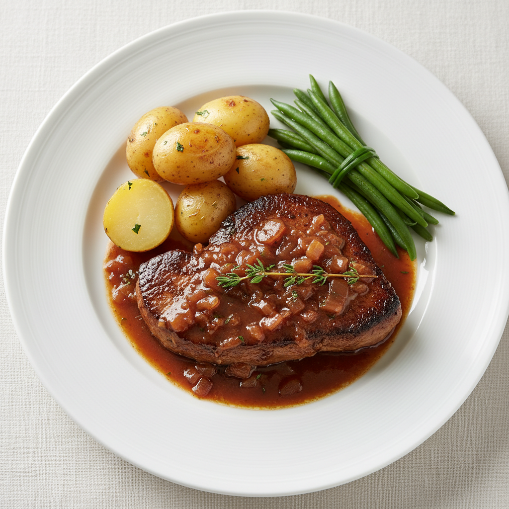 Déclinaisons : Texture modifiée : poêlée de foie finement coupée (SPA). Alternative végétarienne : steaks de lentilles corail poêlés au beurre bio, échalotes, vinaigre balsamique. Variante bio : privilégier foie Label Rouge fermier + beurre demi-sel bio. Sans allergène sulfites : utiliser vinaigre de vin blanc bio à la place de Xérès.