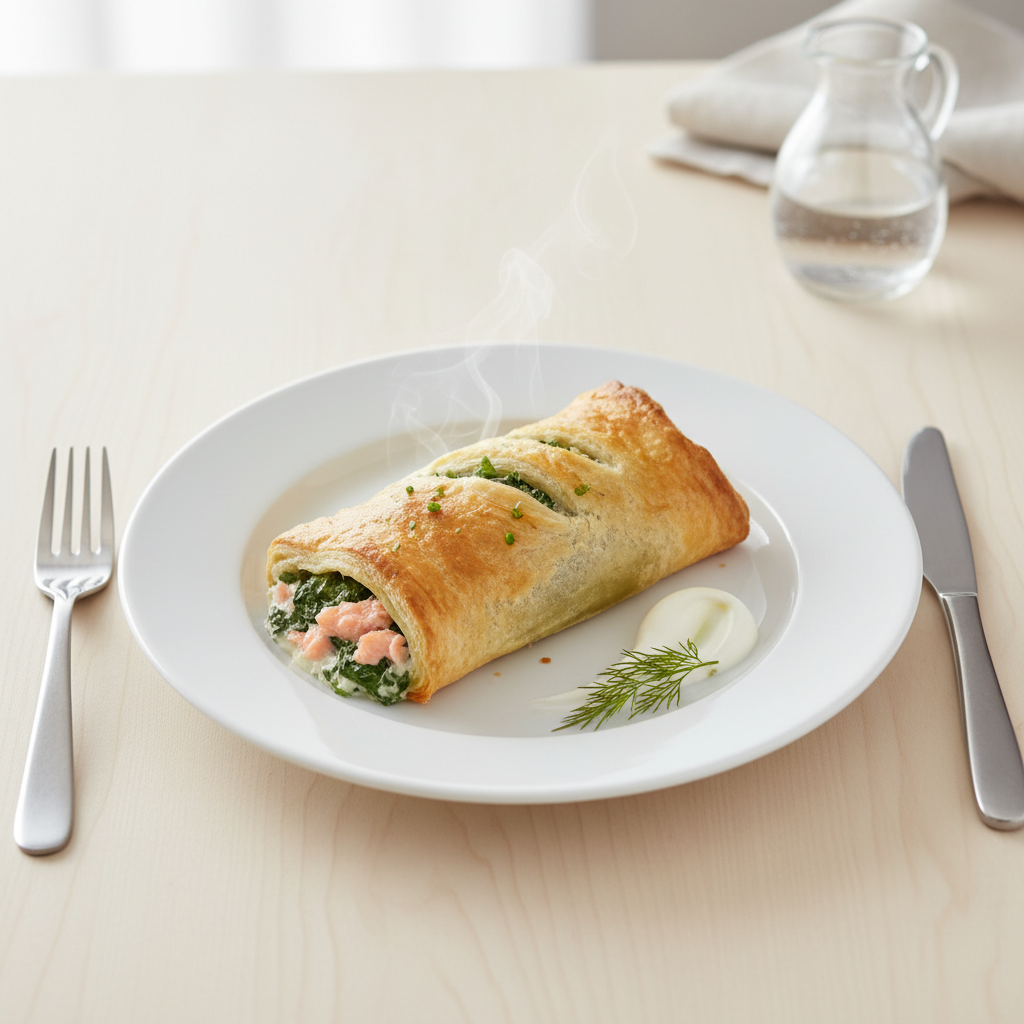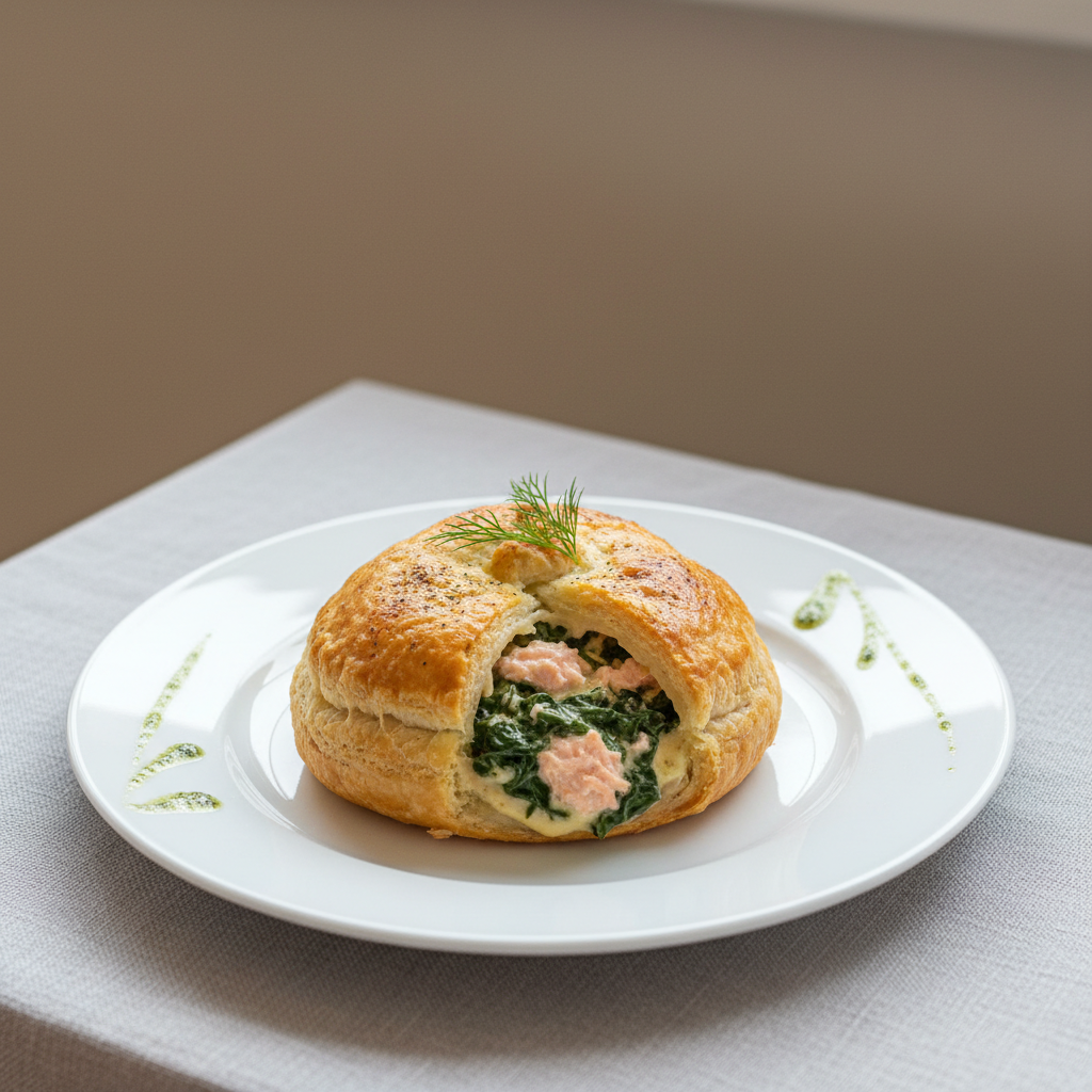 Déclinaisons : Texture modifiée (dysphagie) : réduire friand en cubes, servir avec sauce crème fraîche. Alternative végétarienne : recette 100% végétarienne par défaut. Variante vegan : remplacer fromages par miso blanc/levure alimentaire + noix concassées, crème fraîche par crème de soja. Sans gluten : pâte feuilletée sans gluten certifiée (Schär, Naturli). Sans œuf : vérifier pâte feuilletée industrielle.
