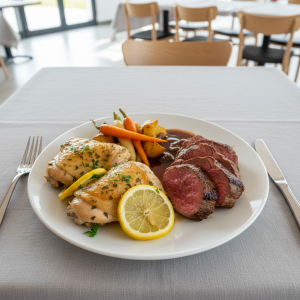 - Cuisson vapeur 20min (pièces 180-200g) : vérifier cœur ≥+75°C thermomètre, jus incolore. Déposer immédiatement sur plateau chaud ≥+63°C.