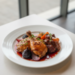Classique incontournable de la restauration collective : hauts de cuisse fermiers aux abricots secs bio. Braissage long à basse température garantissant tendreté et saveur. Conformité EGAlim assurée, coût maîtrisé (€€), zéro déchet (parures valorisées en fond de volaille).