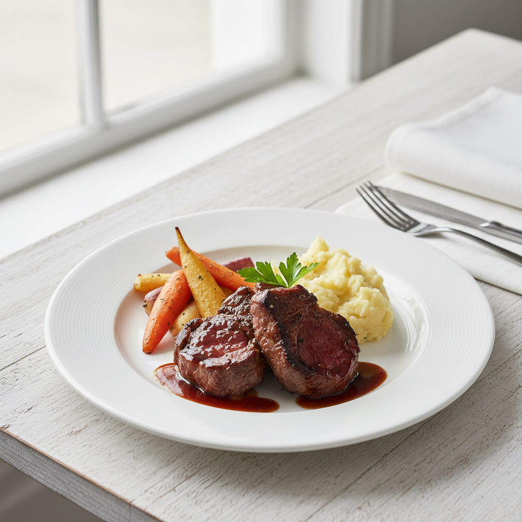 • Glaçage final (+2 min) : Versement sauce réservée J-1 en filet fin, caramélisation douce 30-40 sec de chaque côté. Service immédiat ≥+63°C.