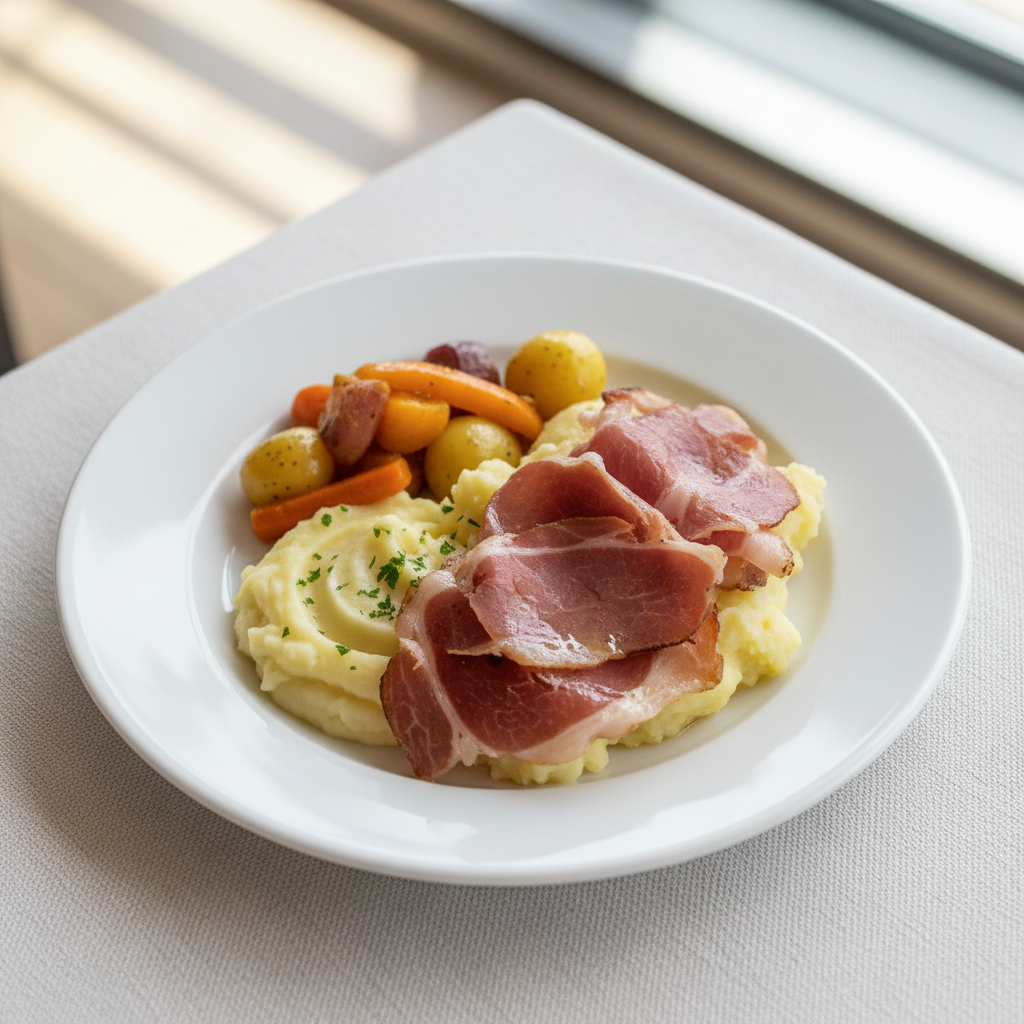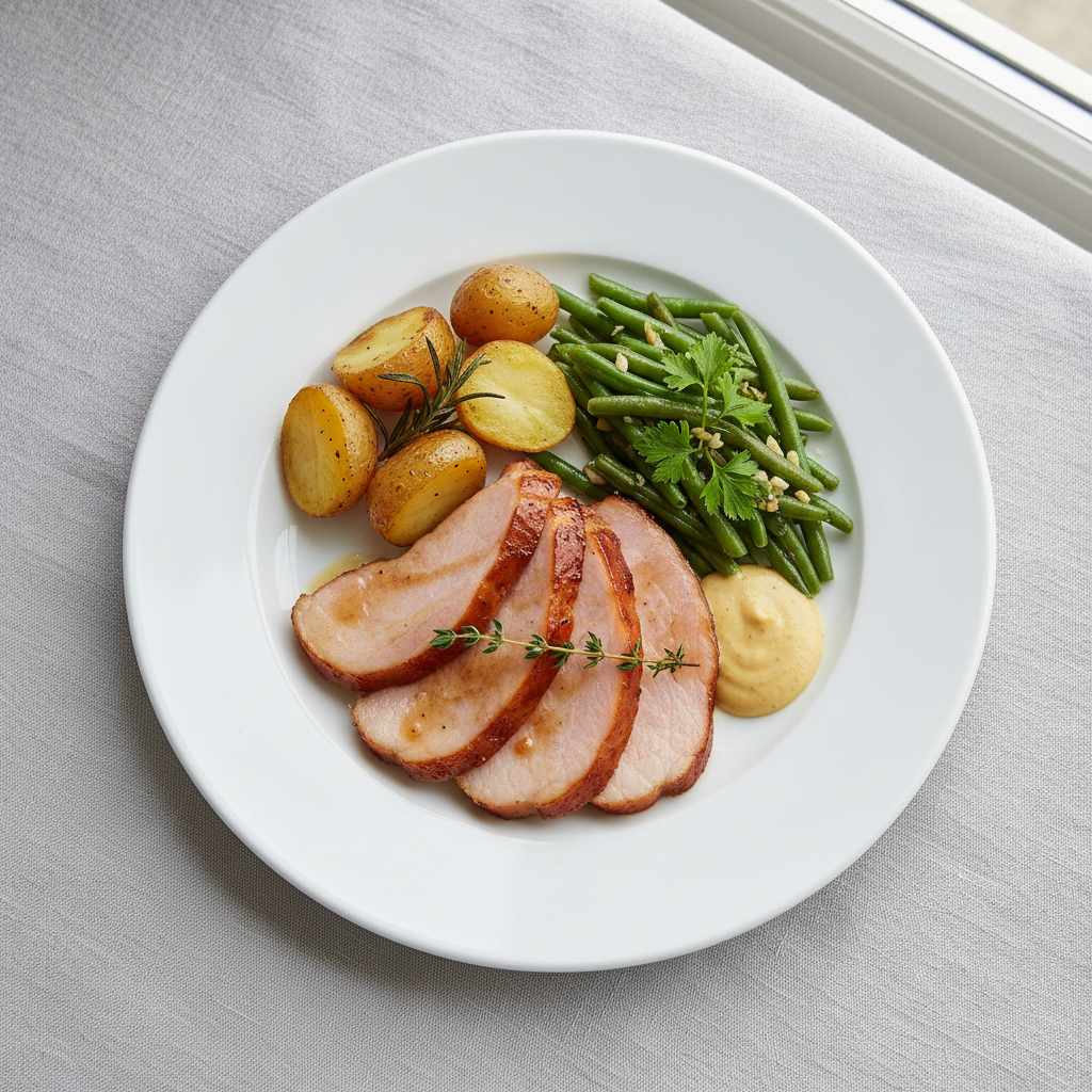 Déclinaisons : Texture modifiée : Jambon haché fin ou émincé très fin pour enfants <6 ans ou difficultés de mastication (réduire en pâte si besoin). Alternative végétarienne : Remplacement par émincé de tofu fumé bio mariné à l'huile d'olive et herbes, ou jambon végétal artisanal (soja/pois). Variante bio : Jambon Ibérico 100% bellota bio ECOCERT ou jambon fermier bio français (Corse, Auvergne). Sans allergène : À vérifier sur chaque lot (nitrites/nitrés, traces possibles de gluten si marinades industrielles — préférer jambon pur sans additifs).