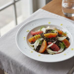 - Incorporation basilic frais ciselé 30 sec avant service (sinon oxydation/noircissement). Vérification assaisonnement : sel réduit 3-4g/kg (olives=sodium), poivre noir moulin. Service à +18-20°C (salade tiède) ou +63°C minimum après bain-marie si liaison chaude.