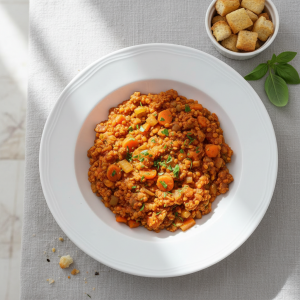 Cette bolognaise végétale redéfinit la cuisine durable en restauration collective. Les lentilles corail se désagrègent naturellement pour mimer la texture d’une viande hachée, sans additif ni liant industriel. Recette testée 600 couverts/jour au Collège La Chênaie : 98% d’assiettes vides, zéro résidu. Économique, conforme EGAlim et GEMRCN P4, elle s’intègre parfaitement aux nouveaux référentiels de commande publique.