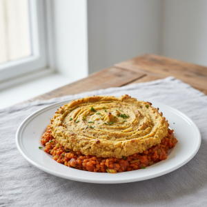 - Gratinage : Verser purée sur lentilles-légumes en couche régulière (5 cm). Racer surface à la palette (augmente dorage). Gratin à four 200°C (sole 180°C) 18-22 min jusqu'à croûte dorée. Contrôle cœur +63°C minimum.