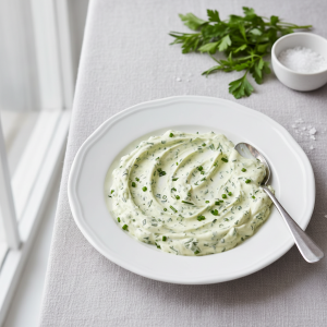 - À 2 heures avant service, incorporer herbes fraîches ciselées finement (basilic, ciboulette, persil, estragon, menthe). Poivre blanc moulu in situ. Stocker en liaison froide à +3°C ± 1°C. Vérifier conservation : durée max 48h.