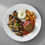 Déclinaisons : Texture modifiée : moules effilochées + sauce mixée fine pour textures adaptées. Alternative végétarienne : champignons de Paris poêlés + crème ail (remplacer moules par 400g/100cvts). Variante bio : certifier tous les ingrédients AB. Sans allergène lait : crème fraîche remplacée par crème de coco bio (30cl/100cvts, même texture).