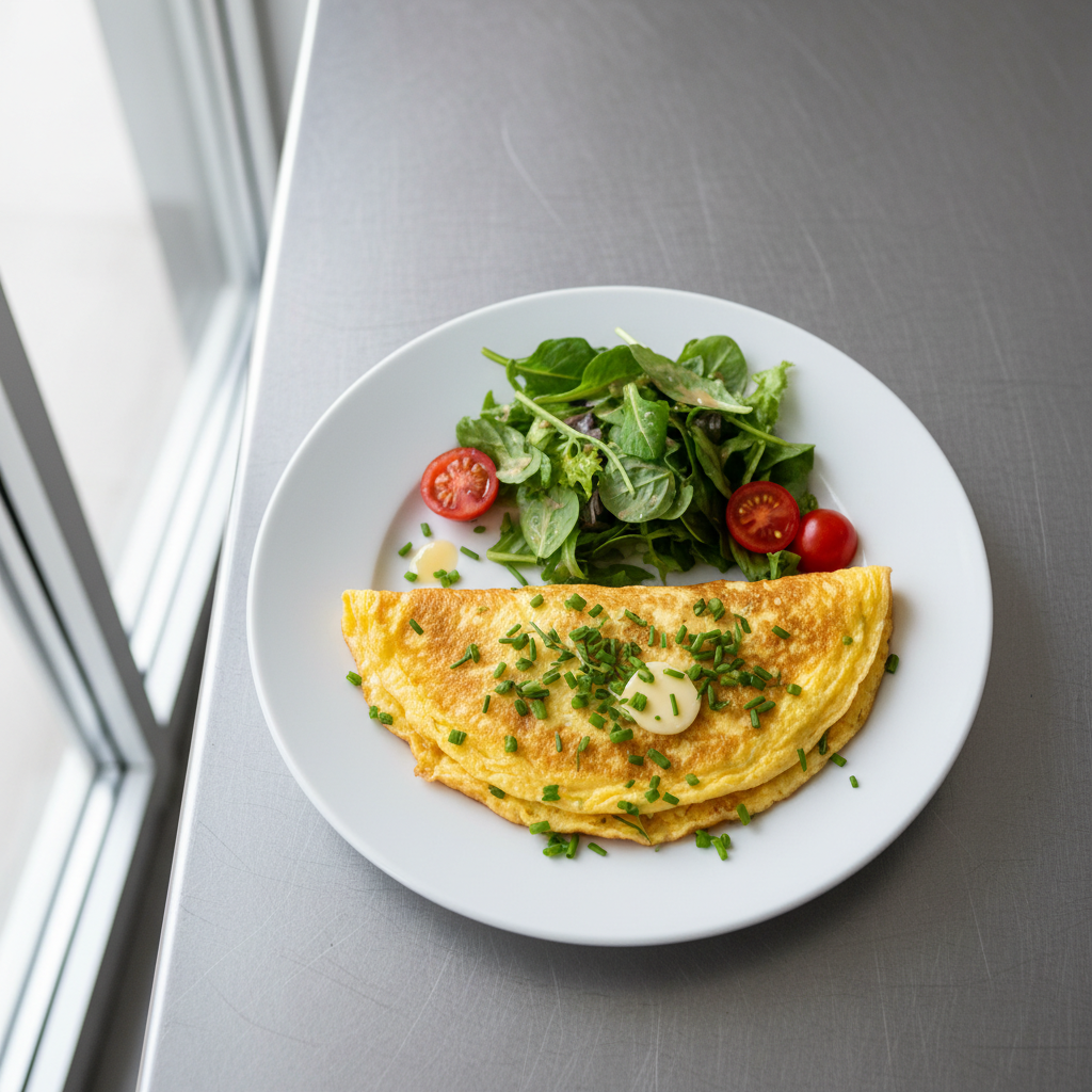 Déclinaisons : Texture modifiée : omelette soufflée pour dysphagie (blancs montés en neige, réduction lait, cuisson vapeur douce). Alternative végétarienne : omelette chanterelles + herbes frais (Printemps-Automne) ou omelette épinards-fromage blanc. Variante bio certifiée : tous ingrédients AB, beurre Échiré ou similaire. Sans allergène œufs : impossible par définition (plat au cœur omelette) — proposer alternative crêpe-œuf ou flan légume à base pomme de terre.