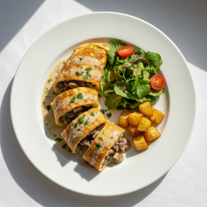 Omelette roulée délicate, pilier des menus végétariens en restauration scolaire. Technique de cuisson basse température (poêle 160-170°C) garantissant texture fondante et respect HACCP. Source protéique majeure (12-14g/100g) intégrant circuits courts bio : œufs fermiers, crème fraîche AOP, champignons frais régionaux.