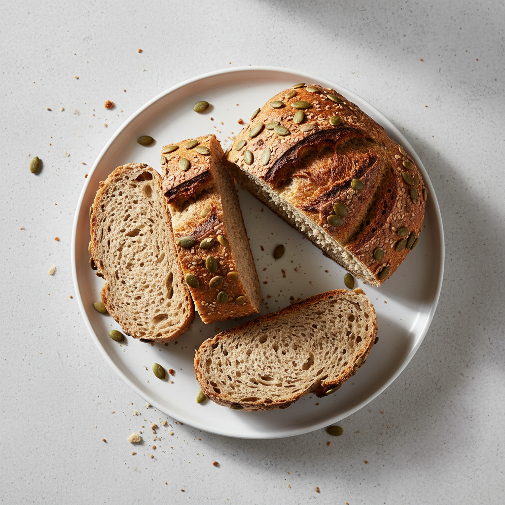 Déclinaisons : Texture modifiée : pain complet sans noix (fibre soluble, patients dysphagie). Alternative végétarienne : nature = déjà 100% végétarien (graines de courge + noix, ratio 50/50). Variante bio : substituer T150 complète par T170 Bio (France), cerneaux bio + certification Demeter. Adaptation sans allergène noix : remplacer par graines de tournesol Bio décortiquées ou graines de sésame complet.