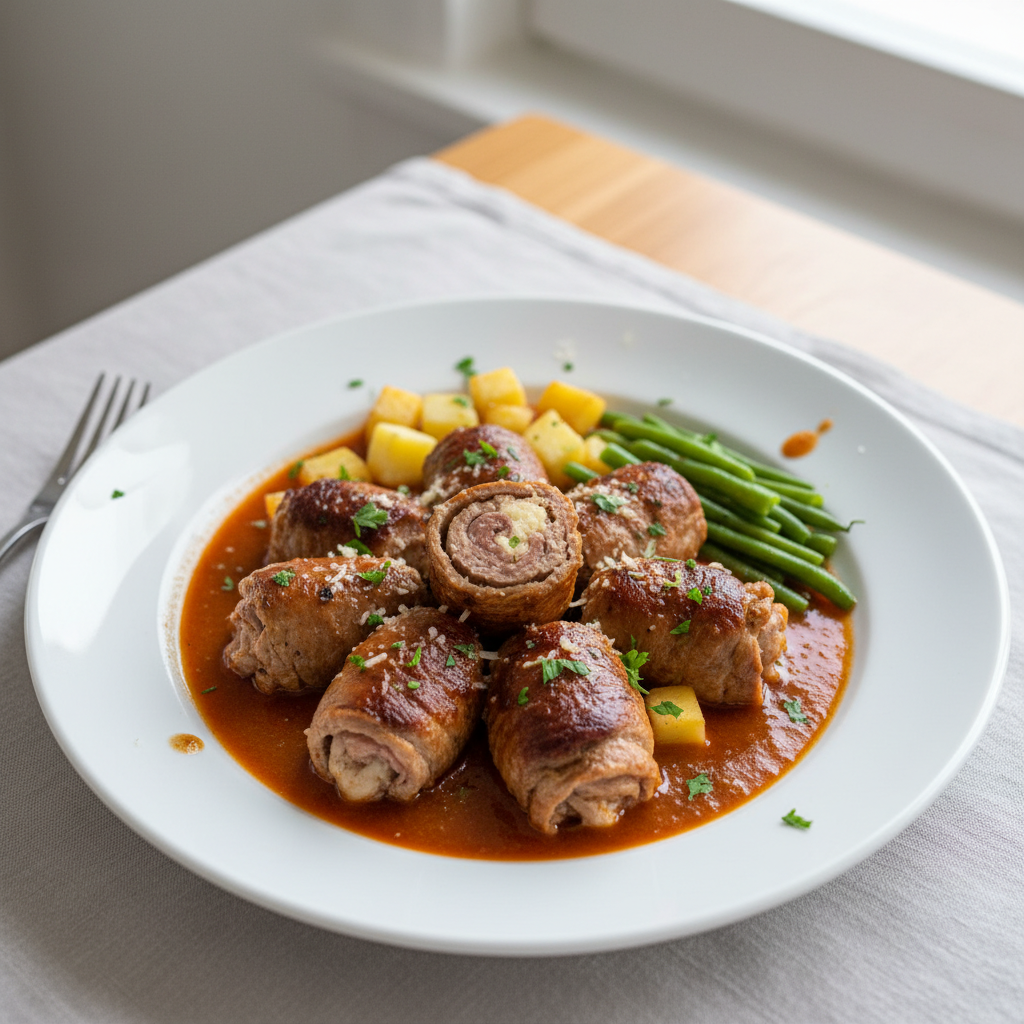 Déclinaisons : Texture modifiée : purée de veau + farce allégée pour seniors/dysphagie. Alternative végétarienne : paupiettes de champignons de Paris + ricotta bio + noisettes concassées, même technique. Variante sans gluten : mie de pain remplacée par purée de pommes de terre (20g/paupiette). Sans lactose : béchamel au lait de chèvre ou boisson végétale avoine bio.