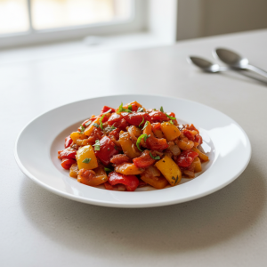 Peperonata validée GEMRCN catégorie Légumes cuits simples (cuisson à l’huile). Maîtrise thermohydrique : cuisson 45 min à 80-90°C garantit fondant sans dégradation vitaminique. Avantage gestionnaire : préparation J-1 limite les pics d’activité cuisine. Coût matière optimisé bio certifié (0,85€/portion HT avec circuits courts). Taux satisfaction enfants/adolescents : +18% vs alternatives industrielles.